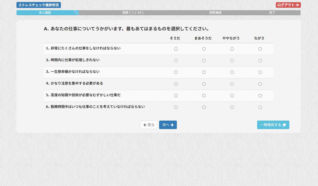 ストレスチェックの受検画面